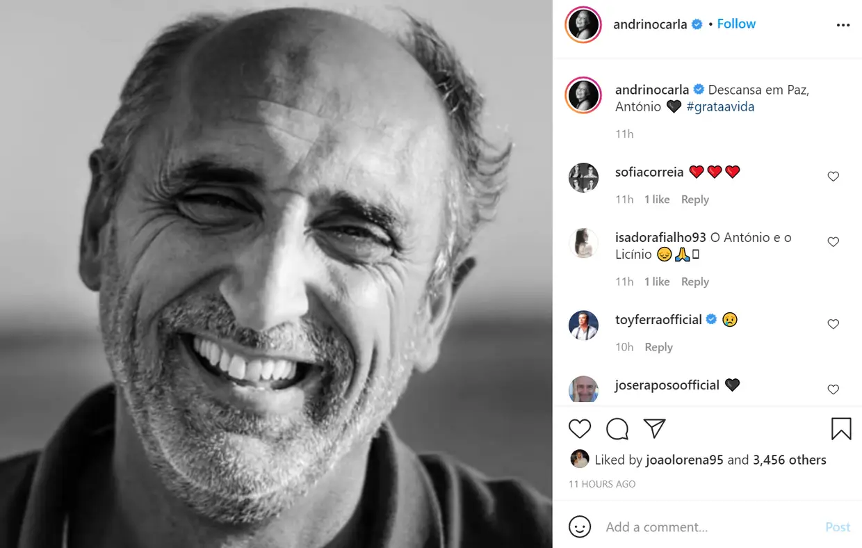 A notícia foi confirmada por fonte querido antónio cordeiro. Descansa na luz e em paz. O ator antónio cordeiro morreu este sábado, 30 de janeiro. Obrigada por teres cruzado o meu. O ator, de 61 anos, sofria de paralisia supranuclear progressiva. Desde 2017 que lutava contra a paralisia supranuclear progressiva. É com tristeza que informamos que nos deixou o ator antónio cordeiro. Descansa na luz e em paz. António cordeiro morreu este sábado, em lisboa, aos 61 anos, informou a academia portuguesa de cinema. Sábado 30 de janeiro de 2021 às 22:27. Há cerca de um ano, com o início da pandemia, antónio cordeiro apanhou um grande susto quando foi diagnosticado. O ator antónio cordeiro morreu este sábado aos 61 anos de idade. 4 atores que morreram em 2021: